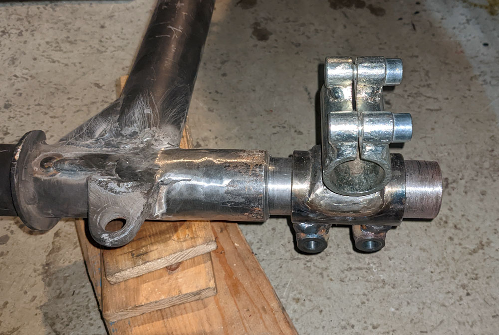 Vorderer Rahmenanschluss mit Kreuzschelle für verstellbares Gelenk am Kugelbolzen der Maschine, wie immer handgedengelt a`la Michel.