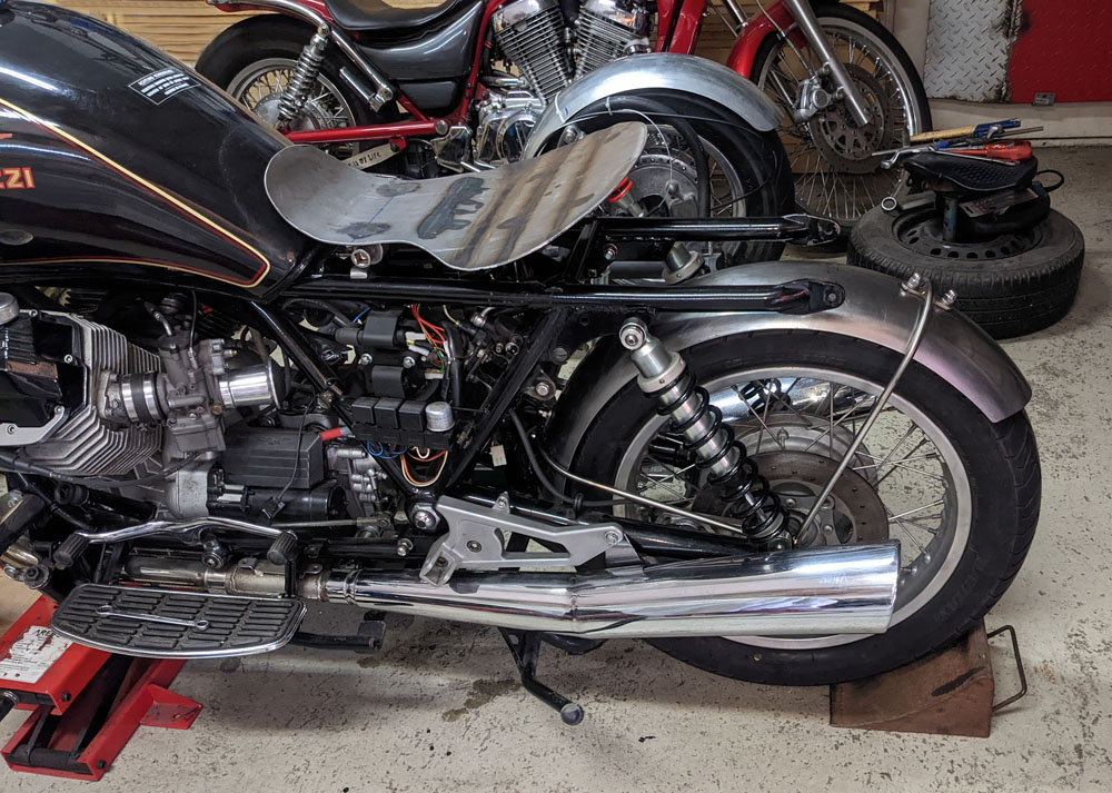 Arschplatte zu Recht gebogen, mit kompensierenden Federbein ausgestattet, und mittig am Moped mit der Waage gerichtet und endgültig abrissfest verbaut und verschweißt, und alles im urbanen Vintage style.