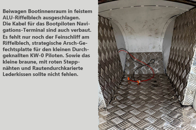 Schepper Blech-Boot schon mal am BW-Rahmen angepasst, Steampunk-Maschnie mit tiefliegendem „(Steib)“ M72-Militär Beiwagenboot, BMW hatte auch ähnliches BW- Boot. Die Vorspur liegt bei 280 mm !!! .
