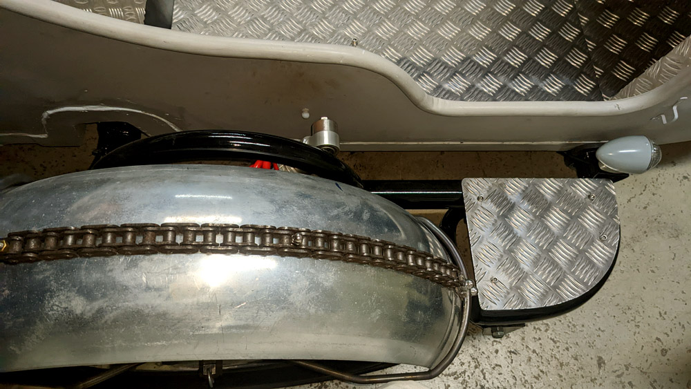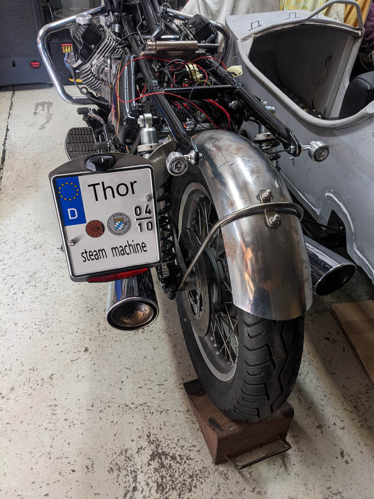Die Ersatz Kardankette griffbereit am Beiwagenfender montiert,für den reibungslosen Austausch, immer gut gerüstet, ein Halali auf die Ersatzteile, Beiwagenfender im Steampunk-Look, passend zur „Thor steam-machin“.