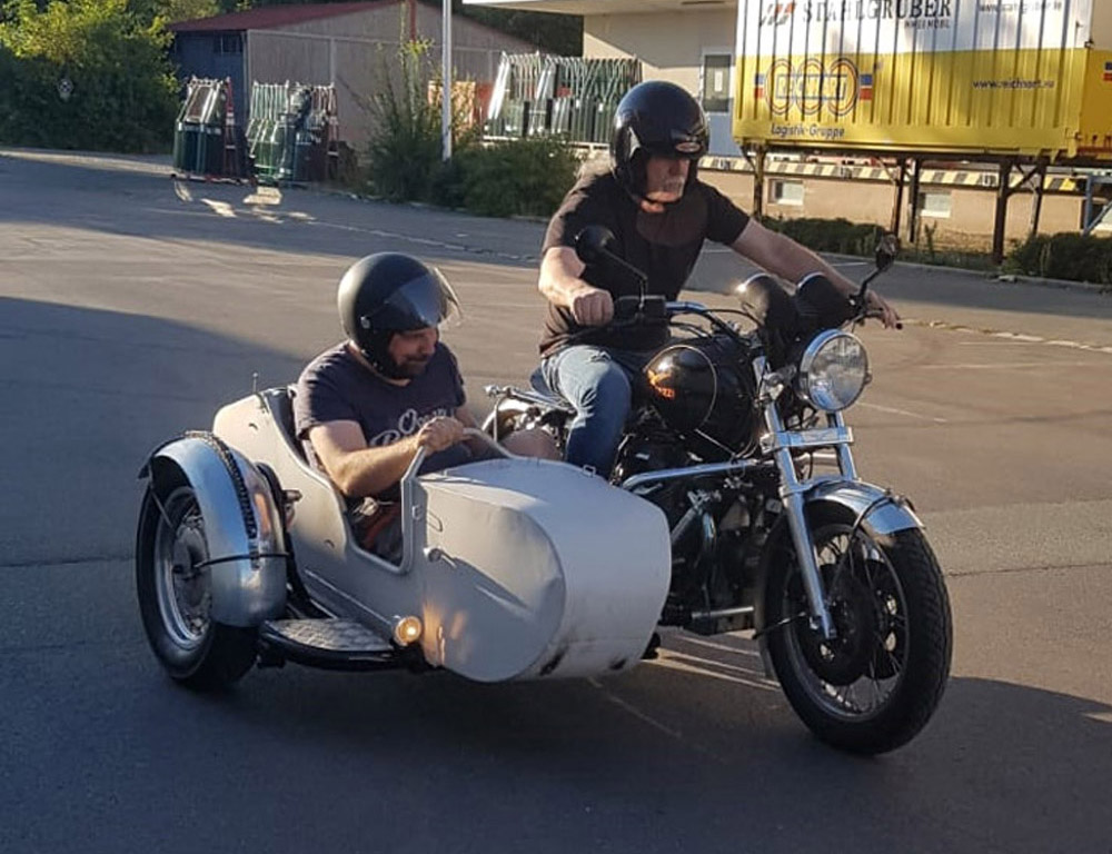 Fahrtechnisch ist der Eisenhaufen gut ausgetrimmt (Fahrwerk!), dass Eisenschwein will in den rechts Kurven ja nicht mal den Fliehkraftgesetzen trotzen, bei einer 180° Grad Wendung bei lauer Geschwindigkeit und einen kleinen Ballast Offizier, bleibt das BW-Rad saugend am Asphalt. Bei steigender Benzinverbrennung wird natürlich das Beiwagenrad den Asphalt verlassen, was ja auch etwas gewollt und cool ist, es soll ja auch noch etwas bespaßen die ganze Dreirad Blech Geschichte, es geht schlingernd immer gerade aus.
