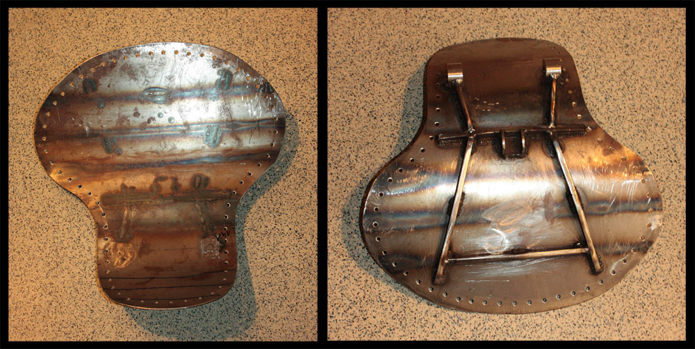 Arschplatte aus 3 mm STAHLBLECH-ZEIT angefertigt, gebohrt für die ALU- Nieten die das Leder am Blech in Form halten.